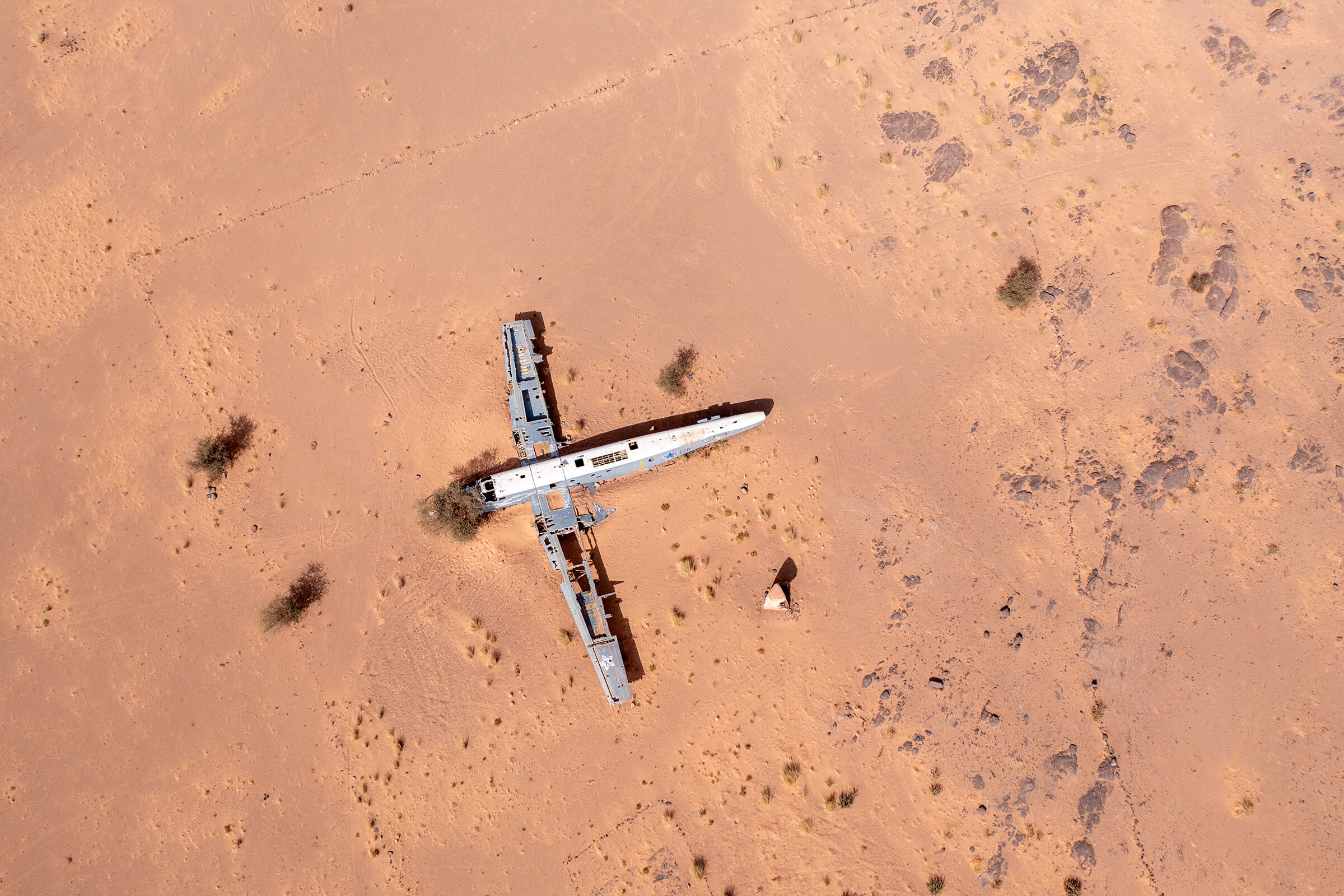 Ich erreiche, 30 Kilometer außerhalb Mauretaniens, auf dem Territorium der DARS, die zum Zeitpunkt meiner Reise genau vor 30 Jahren bauchgelandete „Pelikan“. Dieses Flugzeug der Marke „Avro Shakelton“ diente nach dem 2. Weltkrieg der südafrikanischen Luftwaffe zur Seefernaufklärung, war schon außer Dienst gestellt, wurde 1994 restauriert und zur großen Flugshow nach England eingeladen. Auf dem Überstellungsflug schlug das Kühlsystem über der Sahara leck, zusätzlich brach eine Verbindungsschraube zu einem der Propeller des Langstreckenbombers. Dem Piloten gelang eine perfekte Notlandung. Alle 19 Crewmitglieder überlebten nahezu unverletzt. Ein Funkspruch führte dazu, dass die gesamte Besatzung gerettet wurde. Seither liegt die „Pelikan“ noch vor dem verminten Sandwall der sich 2.500 Kilometer vom Norden in den Süden der Westsahara zieht, als eine Art Symbol dafür im Sand, dass die Wüste stärker ist, als jegliche menschliche Technik. Eine Akazie wächst neben ihrer Kanzel aus dem Sand.